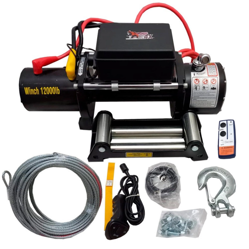 Capacidade Máxima: 12000LBS(5443kg) **Motor: 7.8hp/4.5kwAlimentação Bateria veicular 12v, cabos para fazer a conexão já inclusos.Atenção! Ligar o guincho em uma bateria de 24v fará com que o produto deixe de funcionar imediatamente, ocasionando perda da garantia. Caso queira utilizar com a bateria 24v será necessário adquirir um guincho próprio para tal, consulte nossos representantes.Controle: Controle remoto 2 em 1 com cabo de 3.7mts, e pode ser usado também sem fio.Eixo de Engrenagem: Planetária de 3 EstágiosRelação de redução de engrenagem: 230.4:1Freio / Trava: Freio de retenção de carga automático (Trava automaticamente quando o motor não está acionado)Tamanho do tambor: Diametro 2.5""(63.5mm) x Comp 9.6'(224mm)Cabo: 9.1mm x 28mtsGuia / Rolete: Rolete com 4 viasBateria Recomendada: 650 CCADimensões aproximadas (Comp. x Larg. x Alt.): 538x160x214mmPadrão de Parafusagem na Base (Comp. x Larg.): 10"" x 4.5""(254 x 114.3mm)Peso Aproximado: 40kg
