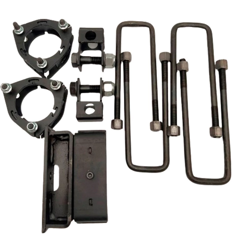 Os prolongadores de amortecedor mantêm o curso do amortecedor após a elevação do carro. E para completar, os grampos de feixe de mola são utilizados para fixar os feixes de mola no eixo do carro.